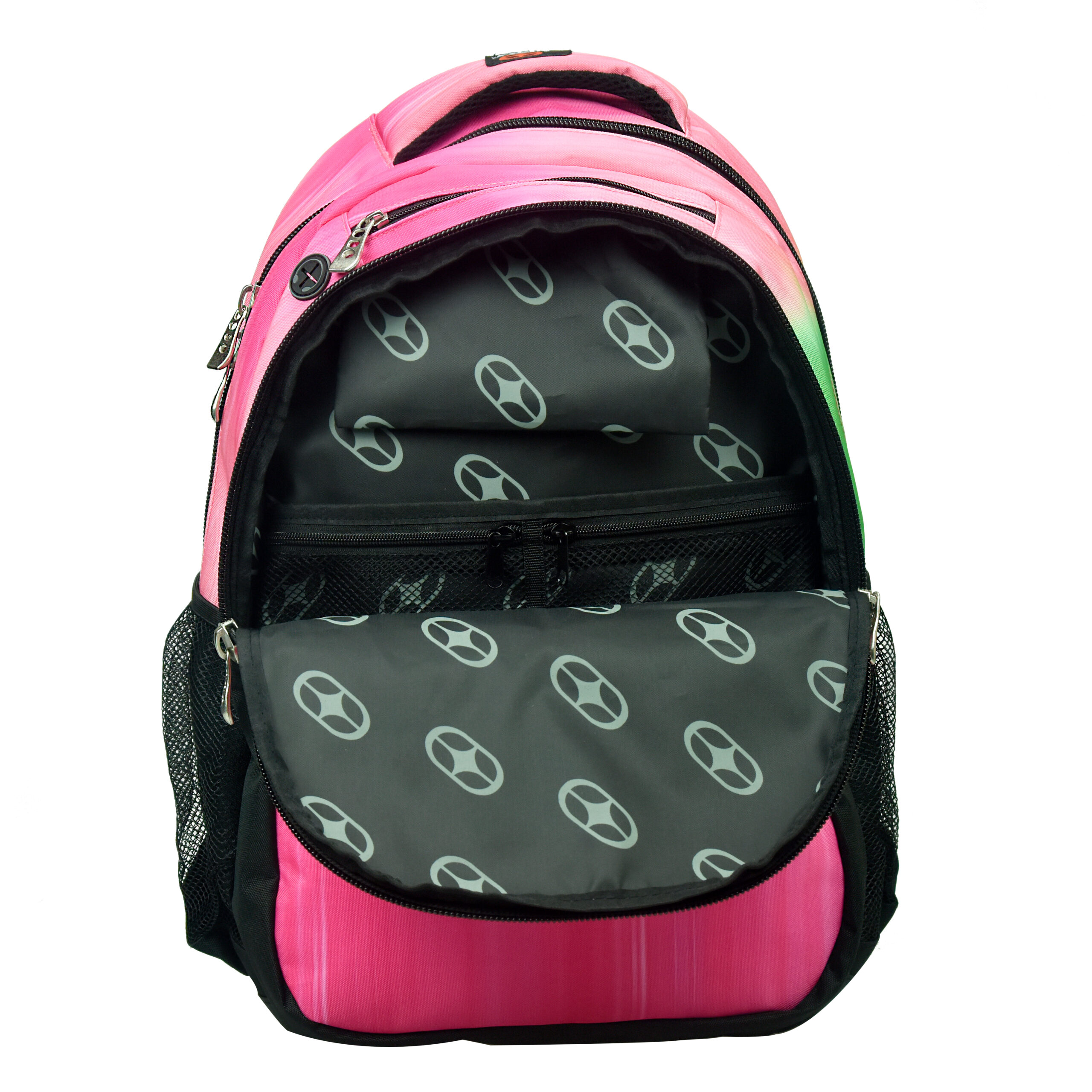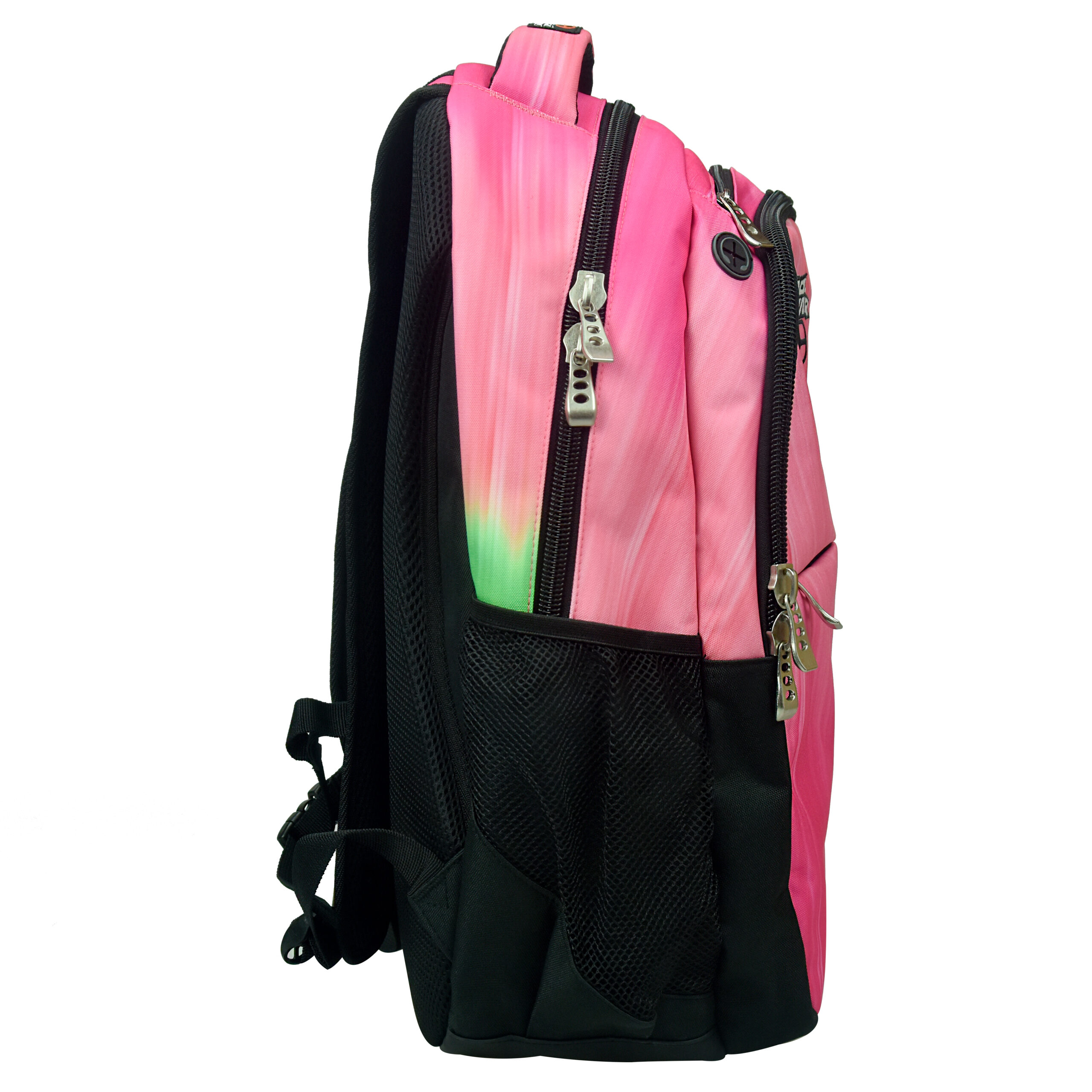 Ghiozdan No Fear roz cu  dimensiune 48 x 30 x 28 cm cu 3 compartimente, spate ergonomic, buretat si aerisit, barete pentru umeri reglabile, buretate.